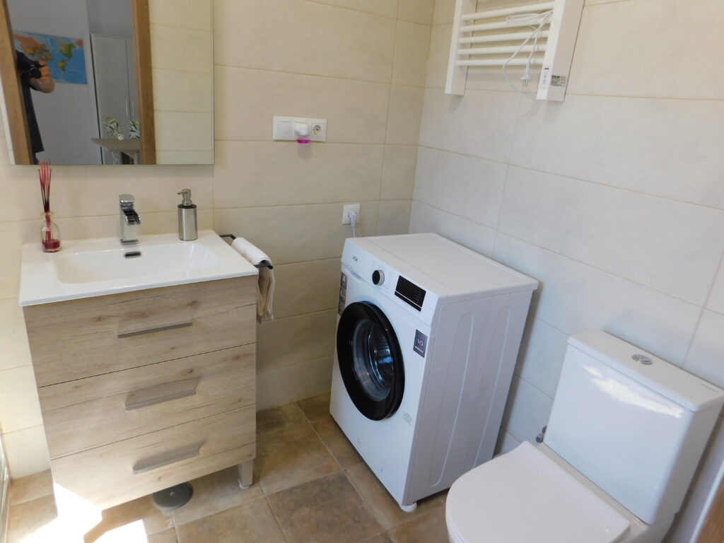 Fully equipped bathroom with washing machine, shower tray, towel heater, etc.